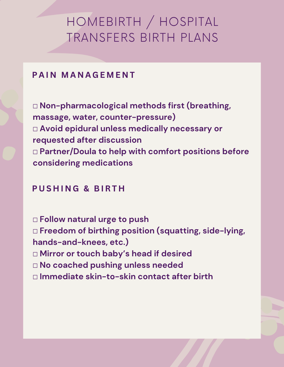This professionally designed ,comprehensive, doula-friendly Birth Plan template is designed for Homebirths with Hospital Transfer considerations— ideal for Birth Doulas or client use.